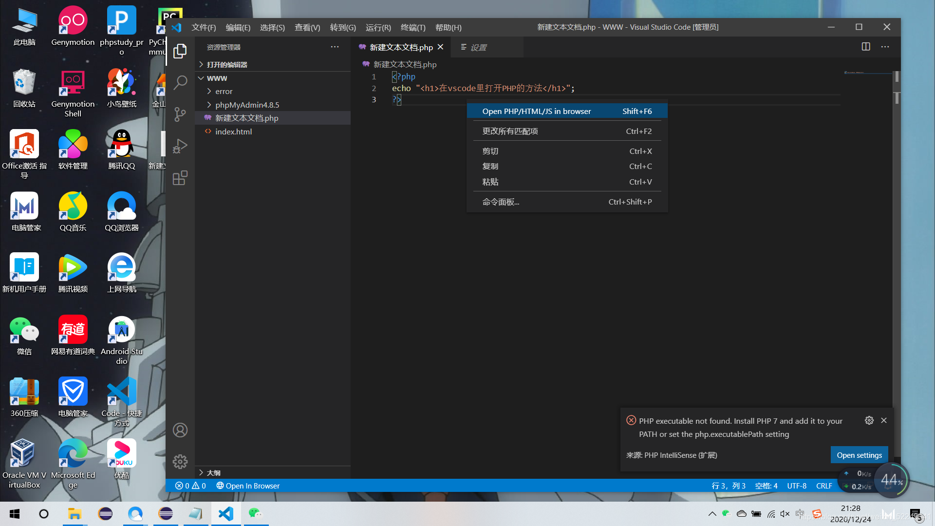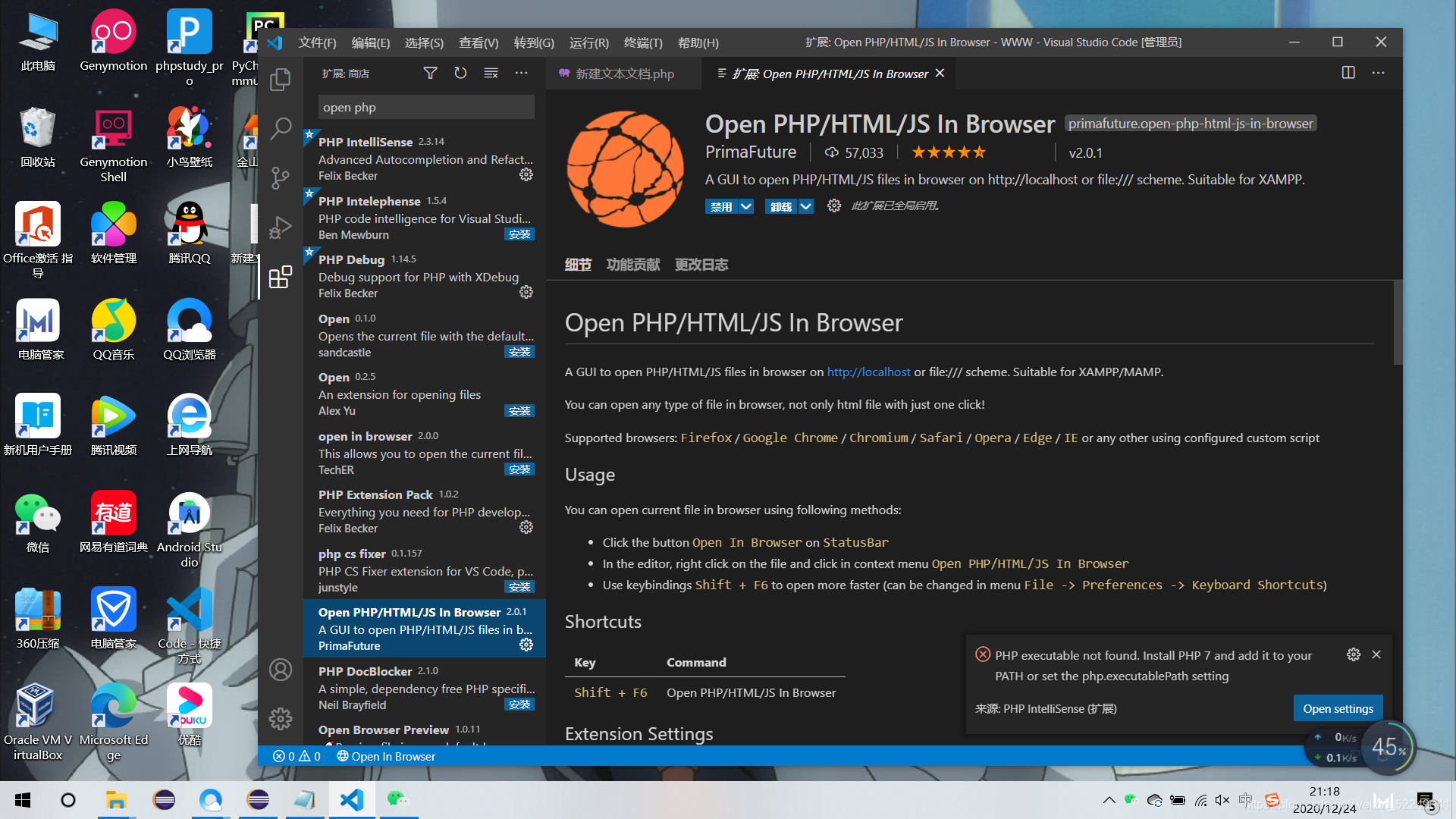 第一次写博客,如有不足,欢迎指正很多小白在第一次使用vscode时总会遇到像这样那的问题,下面我以在vscode中打开php文件为例,跟大家演示一下我是怎么操作的准备工作:先下载小皮面板,记住下载路径,在其中打开Apache和MySQL,然后我们步入正题1.首先打开vscode,在其中打开小皮面板所在文件夹,在WWW文件里随便建一个php类型的文件,简单编辑一下2.点击扩展,搜索openphp,找