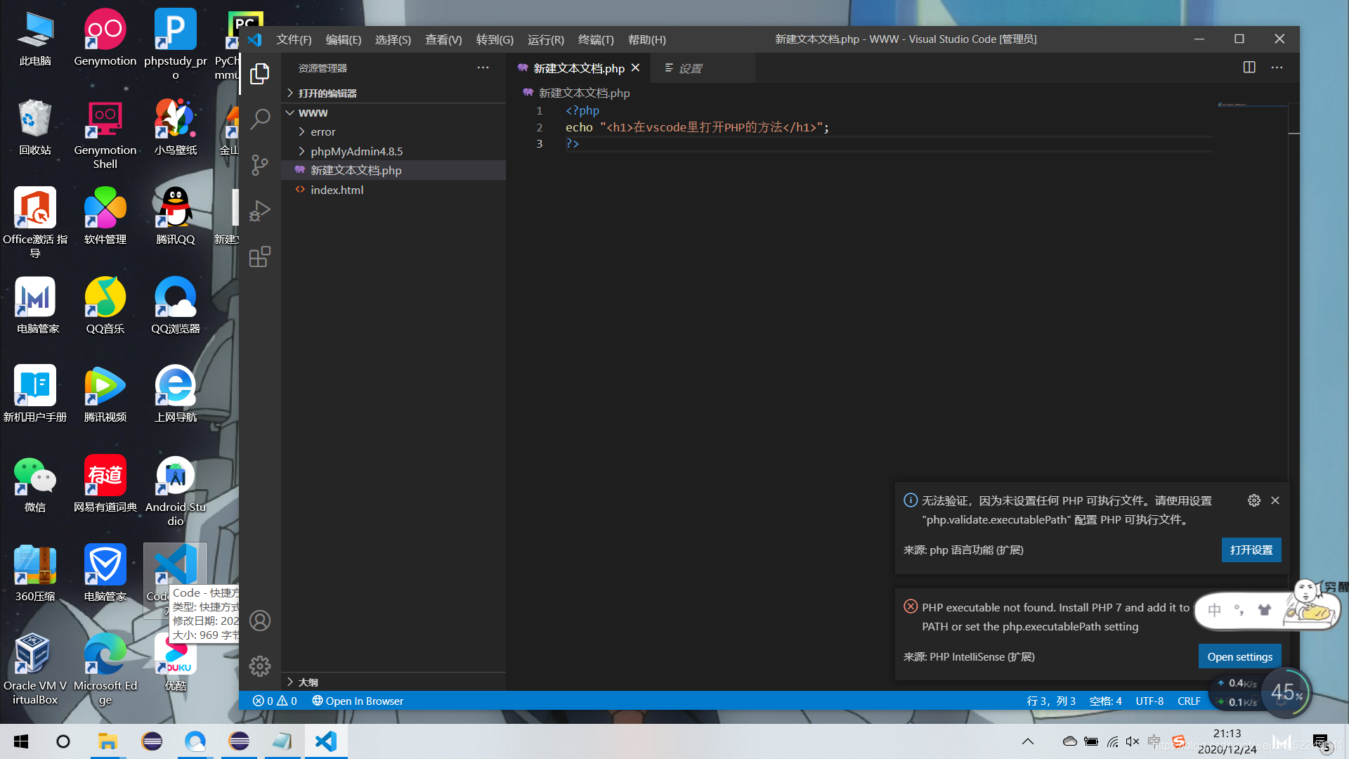1.首先打开vscode,在其中打开小皮面板所在文件夹,在WWW文件里随便建一个php类型的文件,简单编辑一下
